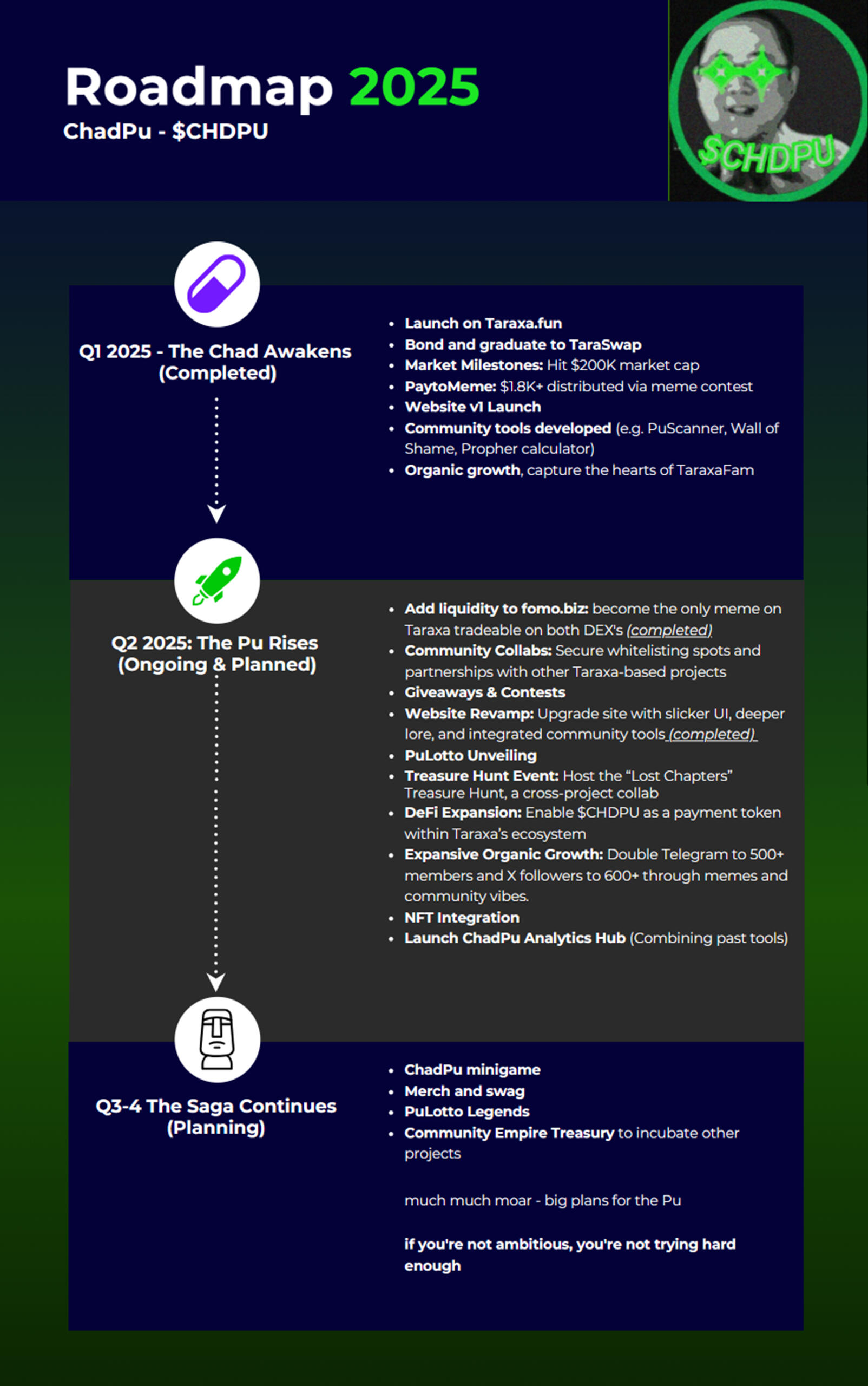 $CHDPU, the first memecoin bonded on Taraxa, fuels the Chadmunity’s charge to hype Steven Pu’s blockchain revolution. Q2 is about amplifying memes, tools, and DeFi dominance. Come for the meme, stay for Taraxa’s tech.x