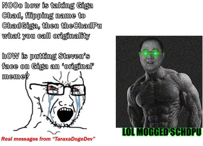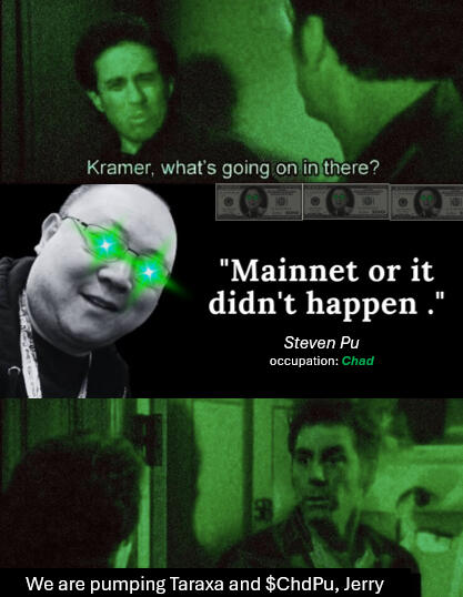 In a world choked by sluggish blockchains, scam fees, and centralized overlords, one man rose above the noise: Steven Pu, the Chad of Taraxa. With a vision to crush legacy chains, Steven forged Taraxa - eats other L1s for their protein and shits them out, now looking for another feast. But how do you wake the masses to this revolution? Enter $CHDPU, the first memecoin ever bonded on Taraxa -a meme so potent it demands attention, drawing eyes to Taraxa’s unrivaled tech.